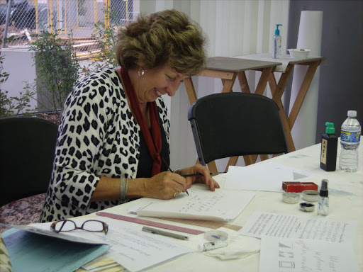 Had a great first day with Barb. She is a very gracious and sharing person. I wonder why it is that calligraphic artists are always so sharing? But they are! We reviewed the formal copperplate hand and then progressed into a more informal script. It is 7:30 and I'm off to the studio to play with new ideas from the day!